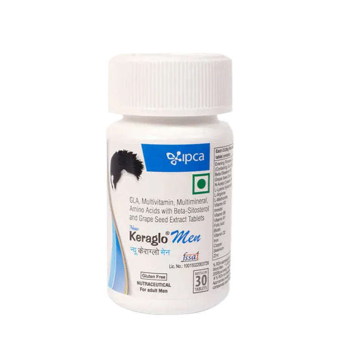 IPCA Keraglo Men Tablet is a nutraceutical supplement formulated to support hair health and scalp nutrition. It contains a combination of botanical extracts, vitamins, minerals, and amino acids that help provide essential nutrients for hair follicles. With regular use as part of a balanced routine, the supplement helps support hair strength, texture, and overall scalp nourishment.