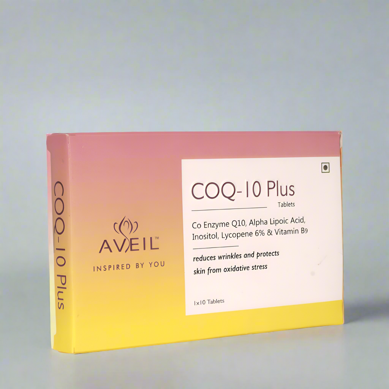 Aveil COQ-10 Plus Tablet is a dietary supplement made with Coenzyme Q10, Alpha Lipoic Acid, Inositol, Lycopene, and Vitamin B9. These ingredients support the body’s natural antioxidant processes and contribute to everyday nutritional needs. The blend is suitable for people who want simple, mindful support for overall wellness and healthy-looking skin as part of their daily routine.