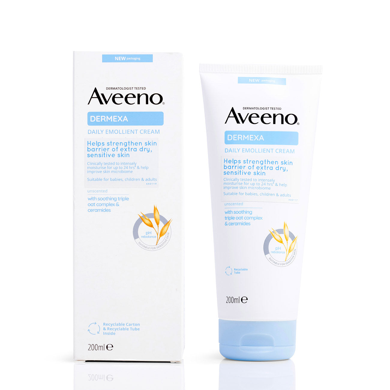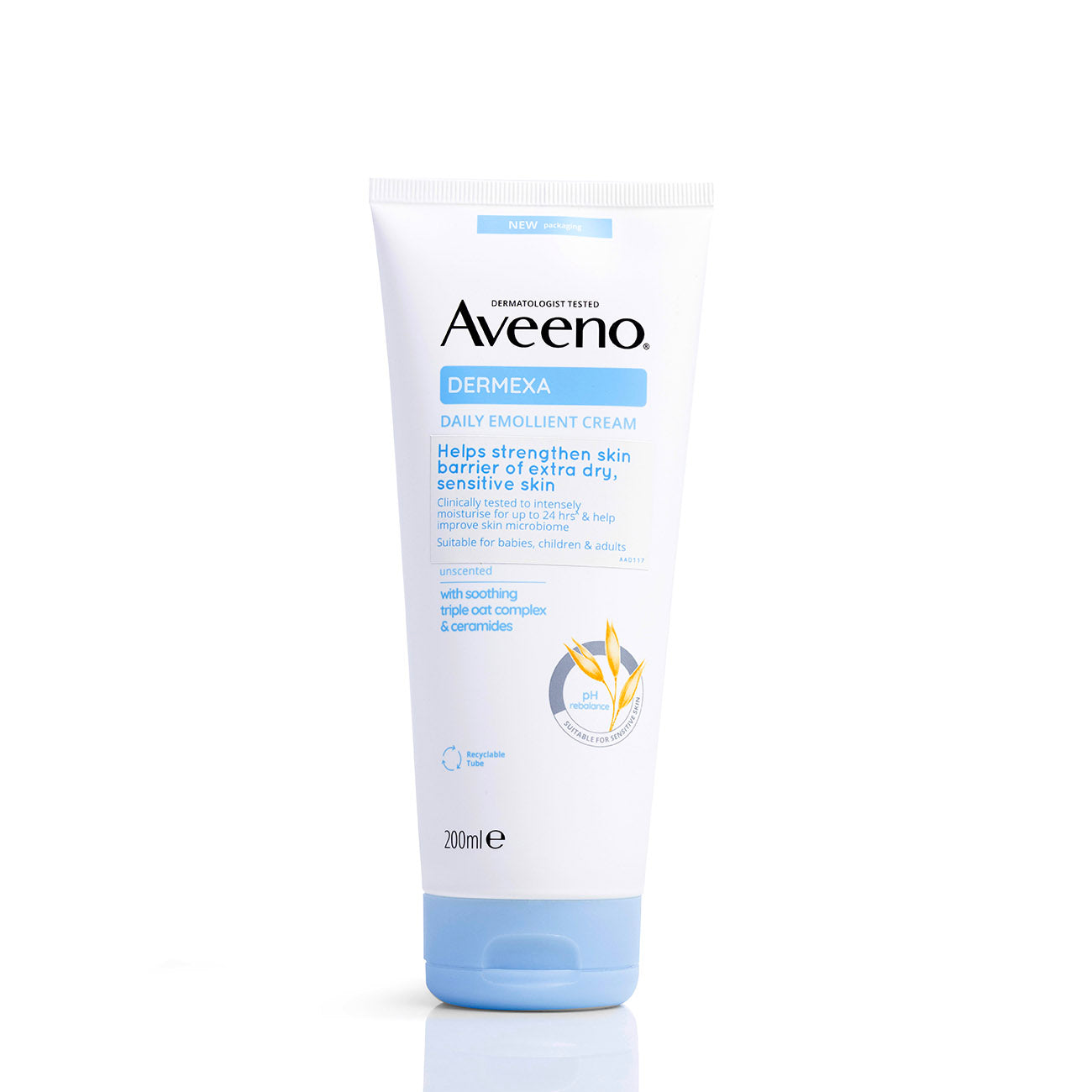 Aveeno Dermexa Daily Emollient Cream is designed to moisturize and soothe very dry and atopic-prone skin, suitable for babies, children, and adults. This clinically proven formula provides immediate comfort and helps prevent flare-ups of intense skin dryness. It contains a pre-biotic triple oat complex and ceramides, which help to improve and stabilize the skin's natural microbiome balance, resulting in healthier and more resilient skin from day one. The effects can last up to seven days after the last application. This high-tolerance, unscented formula is suitable for sensitive skin and dermatologist tested.