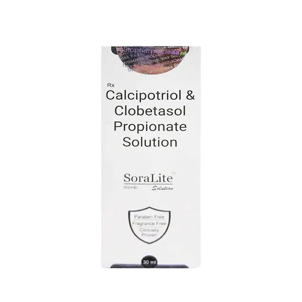 Soralite Solution is a topical dermatological formulation designed to support the management of scaly and inflamed skin conditions. It combines a vitamin D analogue with a corticosteroid to help regulate skin cell activity while soothing visible redness and irritation. The solution is intended for targeted application to affected areas as part of a directed skincare or treatment routine.