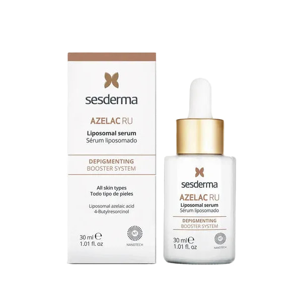 Sesderma Azelac RU Liposomal Serum is a depigmenting facial serum formulated with advanced liposomal technology to support targeted delivery of active ingredients into the skin. It contains a blend of azelaic acid, retinoids, and tranexamic acid to help improve the appearance of uneven skin tone, dark spots, and dullness while supporting overall skin clarity and radiance with regular use.
