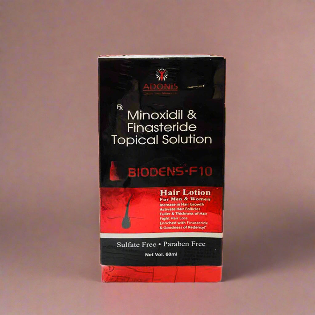 Adonis Biodens-F 10 Topical Solution blends a higher strength of Minoxidil with topical Finasteride to support adults dealing with advanced hair thinning. This combination helps improve scalp circulation and supports active hair follicles, giving hair a fuller and denser appearance over time. The liquid texture spreads easily on the scalp and fits well into a daily routine when used under medical guidance.