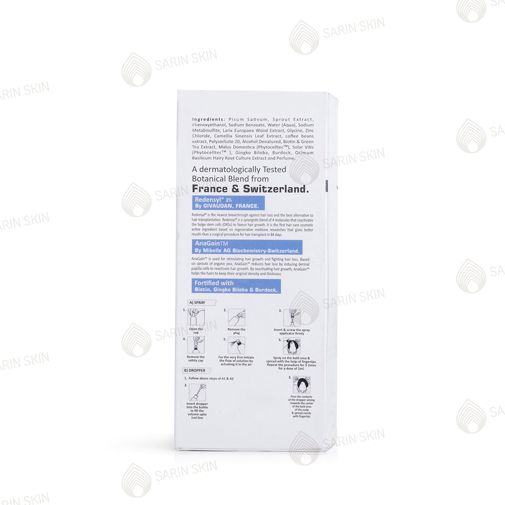 Redensyl (3%): A breakthrough hair growth ingredient that targets hair stem cells and promotes regrowth. AnaGain: Derived from organic pea sprouts
