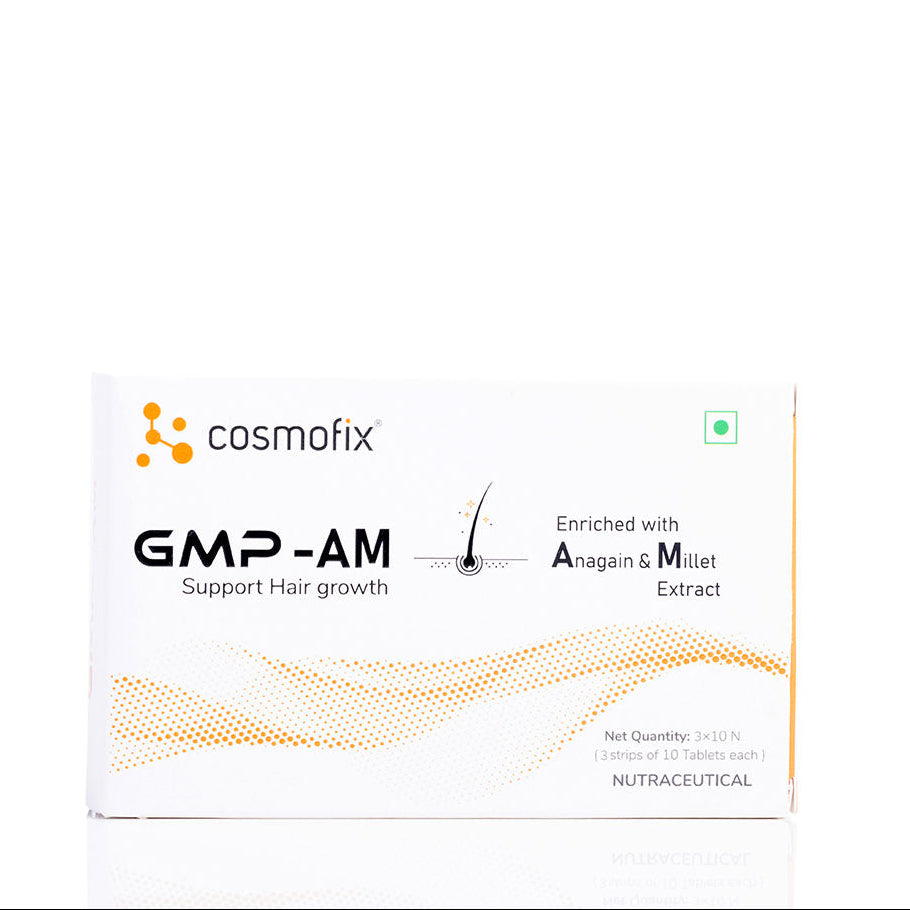 Cosmofix GMP AM is a plant-based daily wellness supplement designed to support overall vitality. Each tablet combines extracts from pea sprouts, millet, amla, chamomile, and rosemary along with biotin, zinc, and essential vitamins. This balanced formula provides nutritional support for hair, skin, and everyday energy needs as part of a healthy lifestyle.