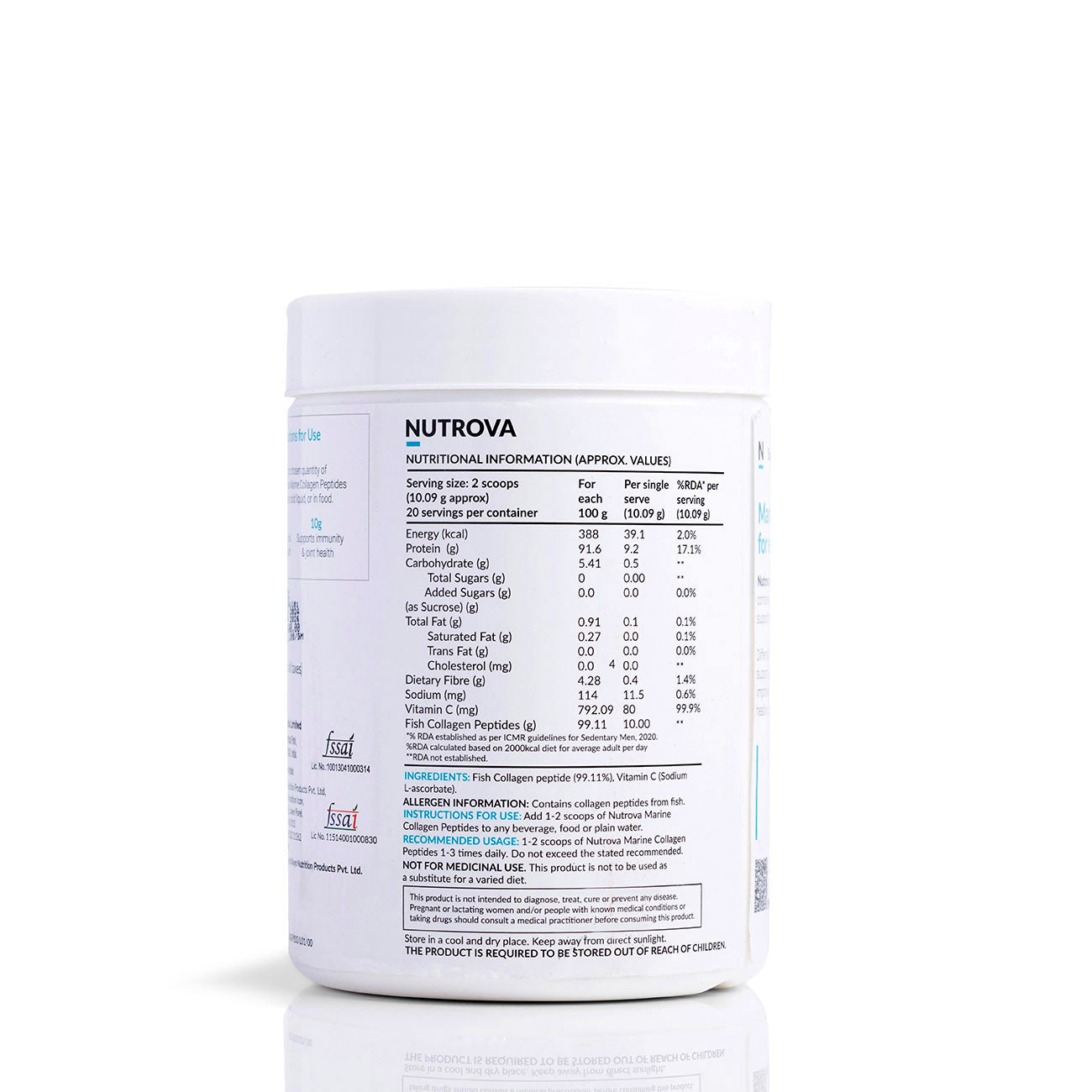 Nutrova Marine Collagen Peptides is a clean, well-tested nutrition supplement made with over 90 percent hydrolyzed marine collagen and added Vitamin C. The low-molecular-weight peptides are designed for easy absorption, helping the body maintain its natural collagen levels. With regular use, it supports healthy skin, stronger hair and nails, and overall bone and joint wellness. It fits easily into a daily routine and can be taken by anyone looking to add gentle, science-backed collagen support to their lifestyle.