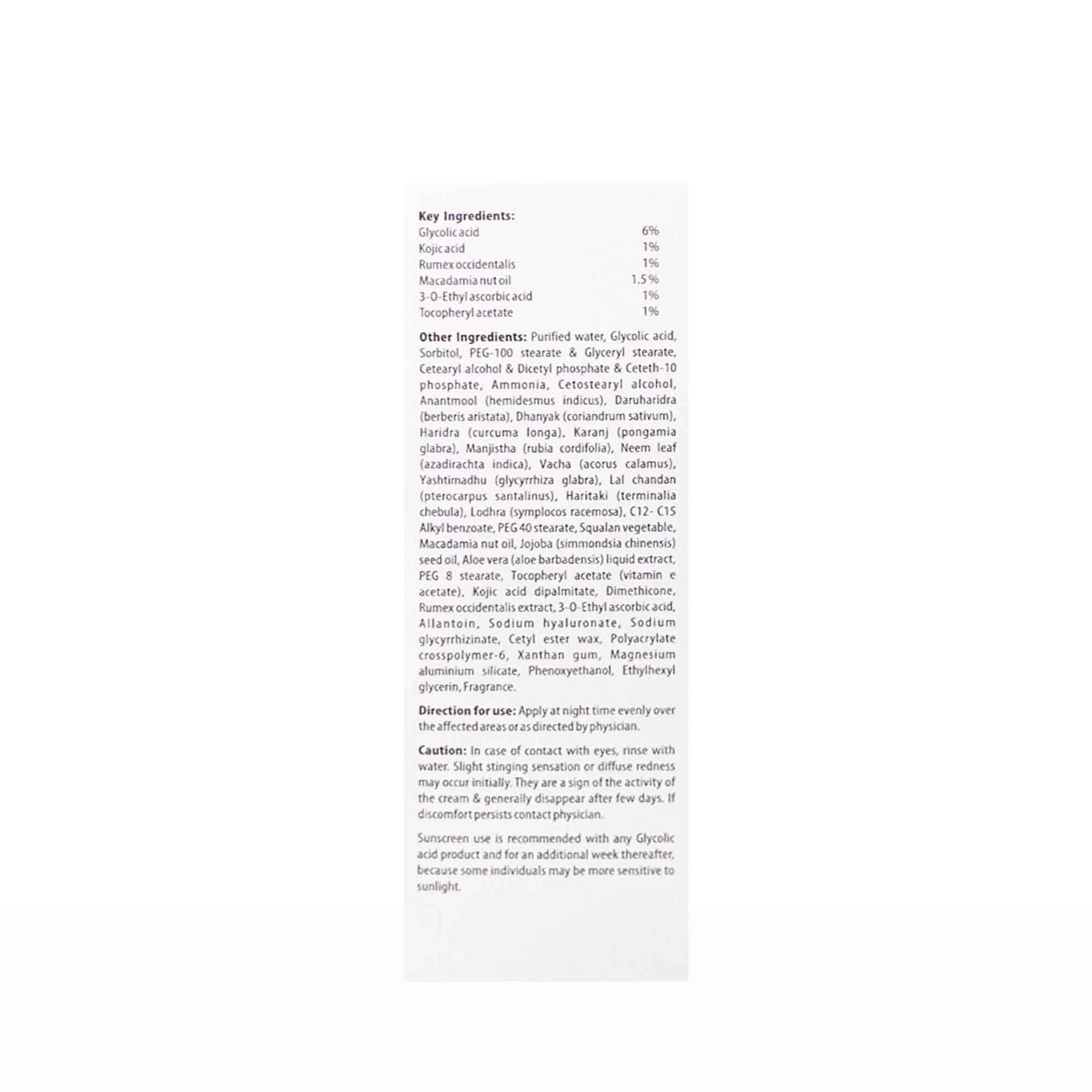 IPCA CutiYt G6 Cream is an advanced depigmenting solution formulated with 6% glycolic acid, 1% kojic acid, 1% 3-O-ethyl ascorbic acid, and 1.5% macadamia nut oil to effectively target melasma, dark spots, and uneven skin tone. Blended with potent botanicals like neem, turmeric, aloe vera, and licorice, it brightens the complexion while soothing and nourishing the skin. With added hyaluronic acid, allantoin, and tocopheryl acetate, this cream offers hydration, exfoliation, and antioxidant protection—ideal for daily use on hyperpigmented, dull, or blemish-prone skin.