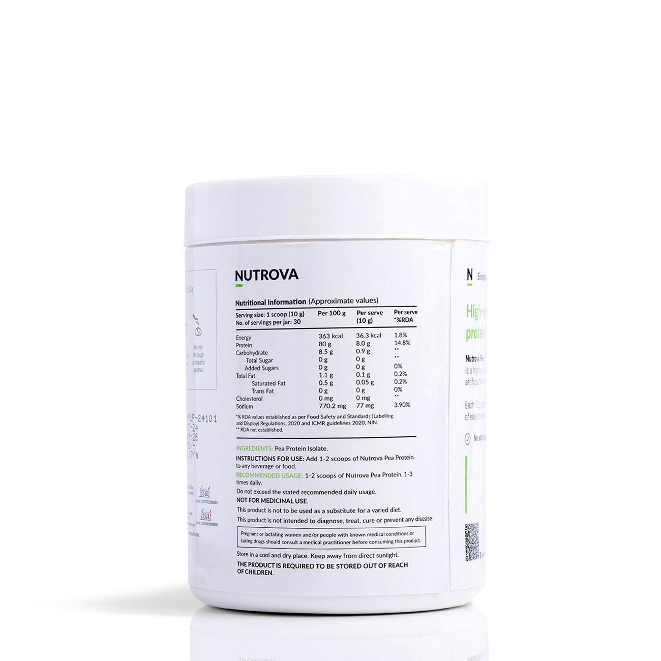 Nutrova Pea Protein is a high-quality, vegan-friendly protein isolate derived from natural green peas. Designed for easy digestion and absorption, it helps support muscle health, fullness, and overall wellbeing — making it an excellent choice for vegetarians, vegans, or anyone looking to enhance daily protein intake. Its smooth texture blends easily into everyday meals like smoothies, dals, or rotis, providing clean, balanced nutrition without additives or artificial ingredients.