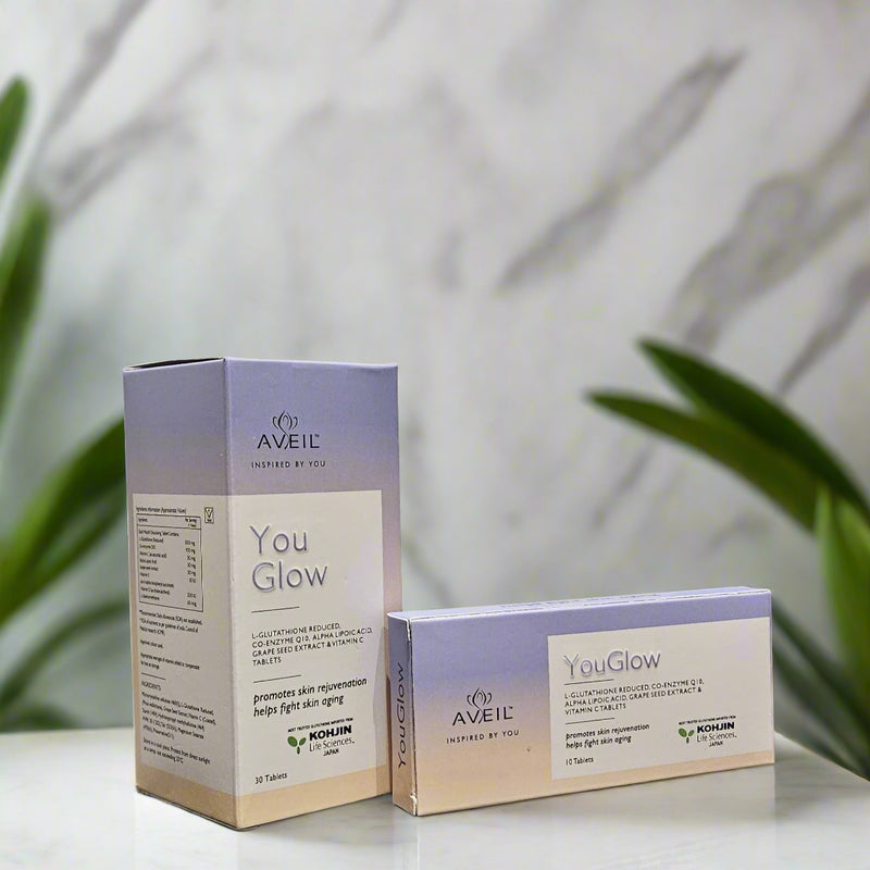 Aveil You Glow Tablet combines L-Glutathione (reduced), Coenzyme Q10, Alpha Lipoic Acid, Grape Seed Extract, and Vitamin C. This blend supports the body’s natural antioxidant activity and contributes to everyday skin wellness. It fits easily into a balanced routine for people who want simple, mindful support for healthy-looking skin.