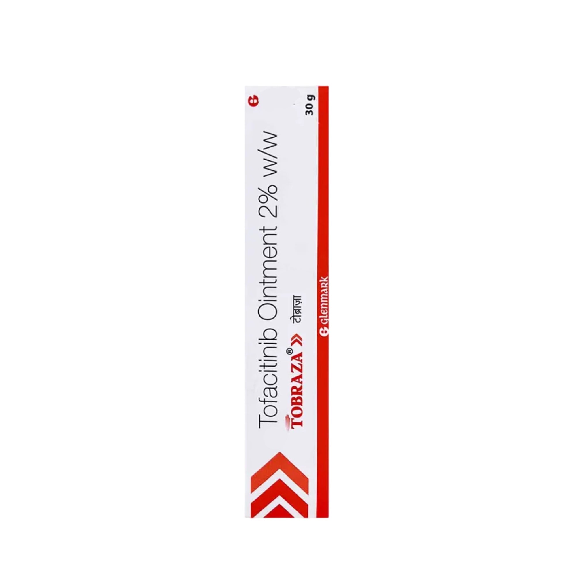 Tobraza Ointment is a topical formulation containing Tofacitinib Citrate 2% w/w, commonly recommended under medical supervision for managing certain inflammatory skin conditions. As a Janus Kinase (JAK) inhibitor, it works by modulating pathways involved in skin inflammation, helping reduce redness, itching, and irritation when applied to affected areas.