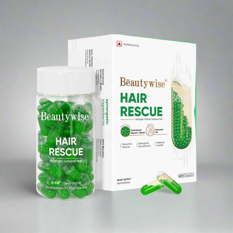 Experience the transformation with Beautywise Hair Rescue Capsules. Powered by dual-action technology, these capsules combine the benefits of hydrolyzed keratin, biotin, and amino acids to strengthen and volumize your hair. Say goodbye to hair fall and hello to rapid regrowth. Myo Inositol and DHT blockers combat thinning while intense hydration from avocado oil restores luster. Complete hair nutrition ensures longer, thicker locks. Achieve the hair you've always wanted with Beautywise Hair Rescue Capsules – science meets beauty in one powerful formula.