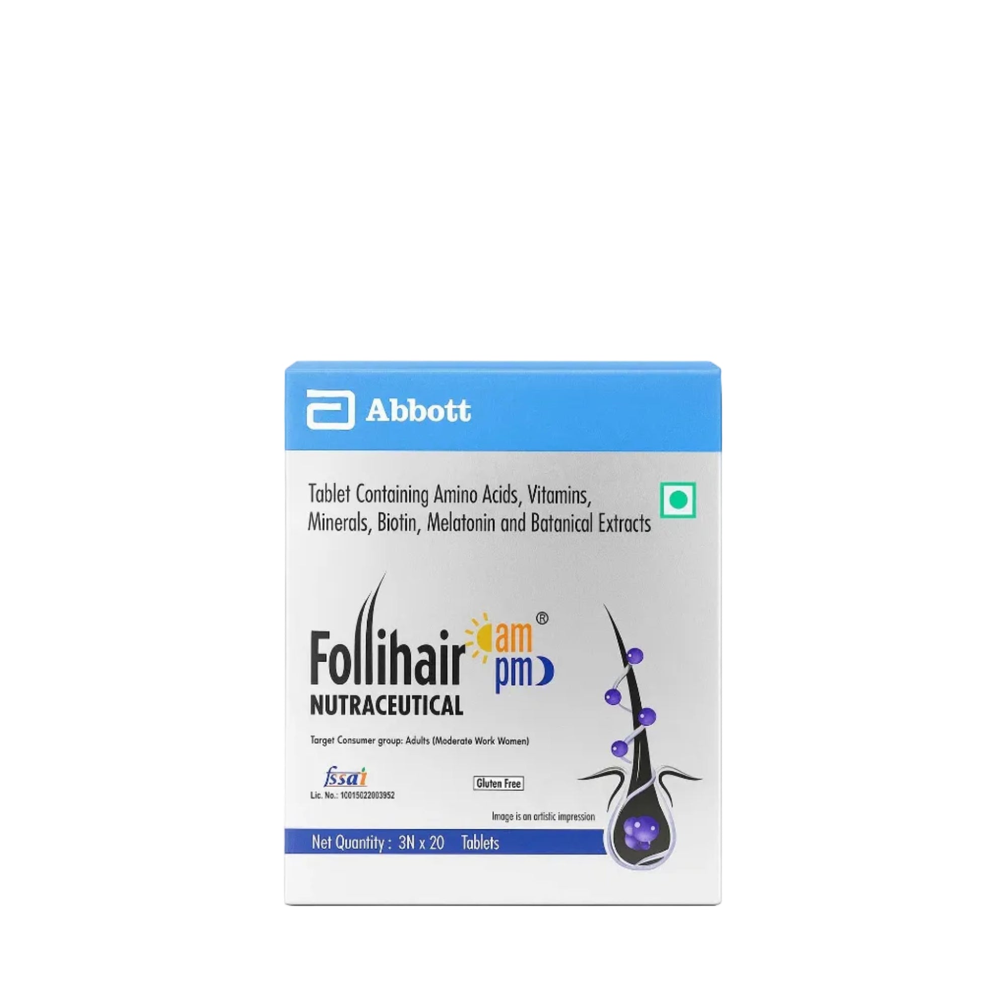 Follihair Nutraceutical Am Pm Tablet is a day and night nutritional formulation designed to support overall hair nutrition and scalp health as part of a regular wellness routine. The combination of amino acids, vitamins, minerals, botanical extracts, and antioxidants helps support hair strength, hair vitality, and normal hair cycle function with consistent use.