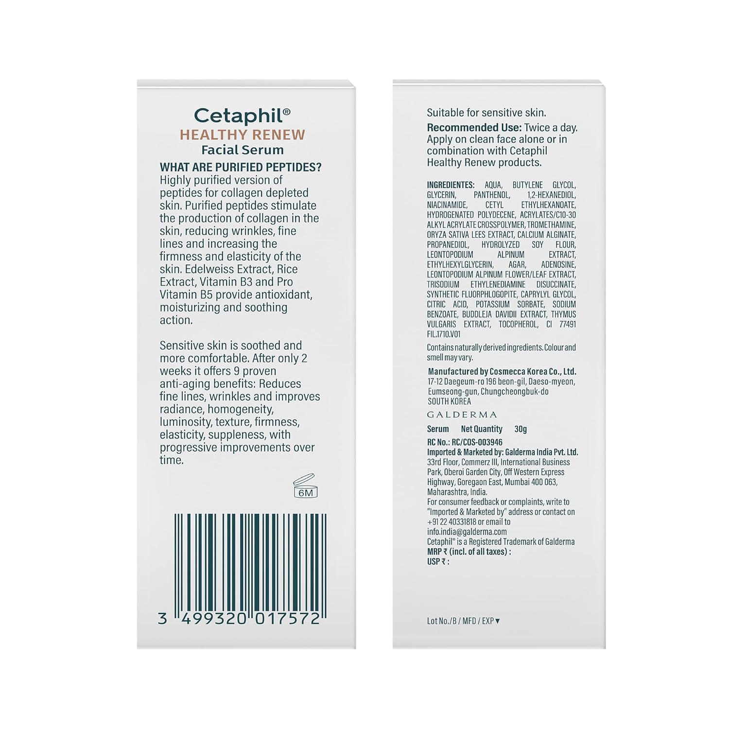 Cetaphil Healthy Renew Facial Serum is a lightweight facial serum formulated to support skin appearance during the visible aging process. It is designed for regular day and night use on sensitive skin and helps improve the look of skin texture, tone, and overall radiance. The fast-absorbing formula focuses on hydration, skin comfort, and barrier support while fitting easily into daily skincare routines.