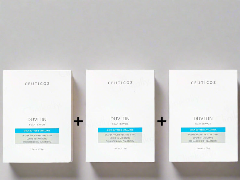 Ceuticoz Duvitin Soap is a hydrating, skin-friendly cleanser designed to cleanse gently while preserving the skin’s natural moisture barrier. Infused with Vitamin E, Sodium PCA, Shea Butter, and Olive Oil, it helps lock in hydration, improve skin elasticity, and protect against dryness and flakiness. Its rich, creamy lather leaves the skin soft, smooth, and nourished after every wash, making it ideal for dry, sensitive, or rough skin.