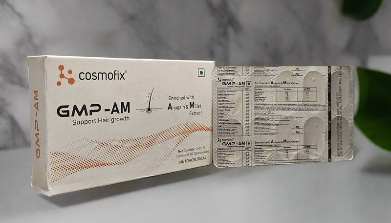 Cosmofix GMP AM is a plant-based daily wellness supplement designed to support overall vitality. Each tablet combines extracts from pea sprouts, millet, amla, chamomile, and rosemary along with biotin, zinc, and essential vitamins. This balanced formula provides nutritional support for hair, skin, and everyday energy needs as part of a healthy lifestyle.
