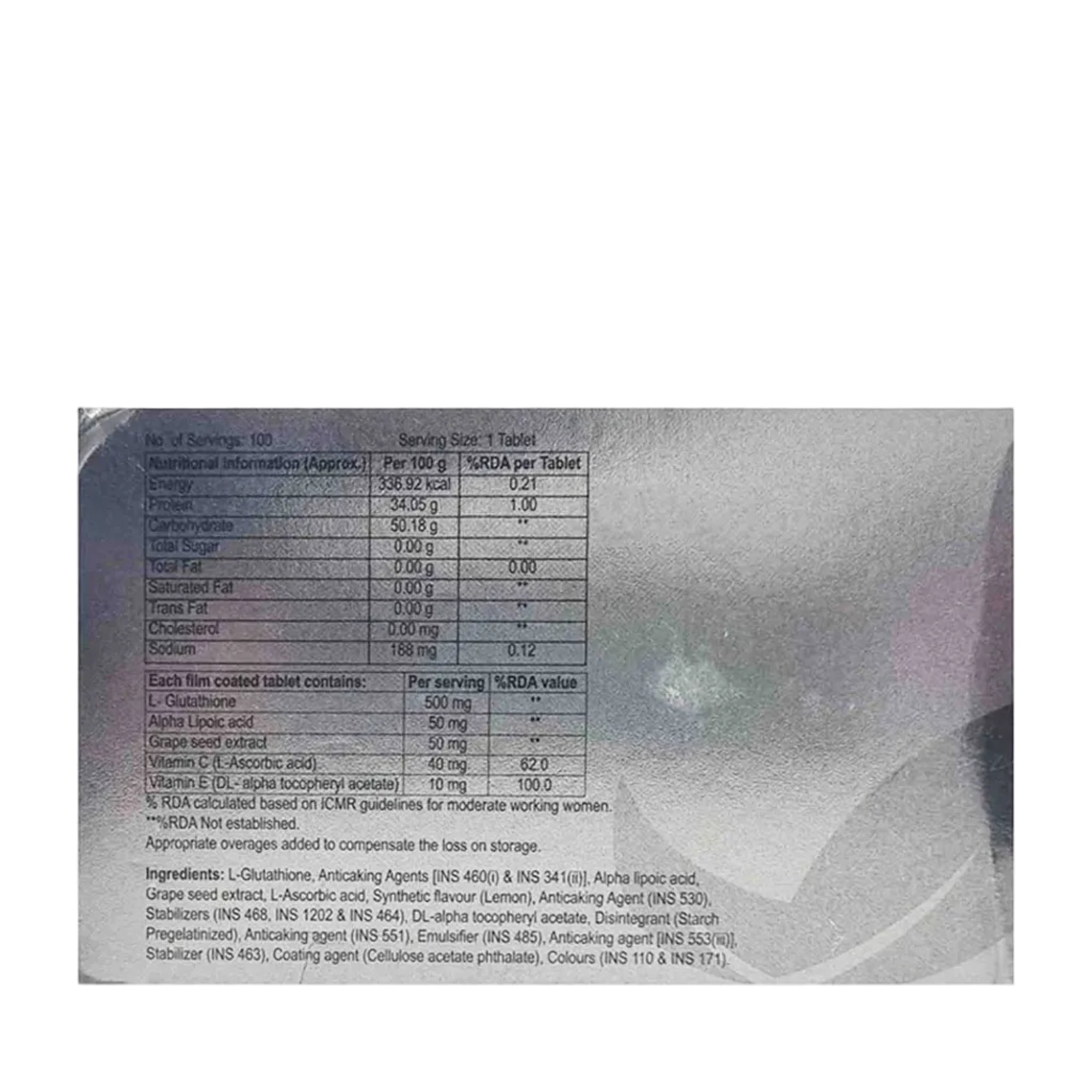 Havglo Tablet is a nutritional supplement formulated with a blend of antioxidants including L-Glutathione, Vitamin C, Alpha Lipoic Acid, Grape Seed Extract, and Vitamin E. The formulation is designed to support daily nutritional intake and contribute to overall wellness.