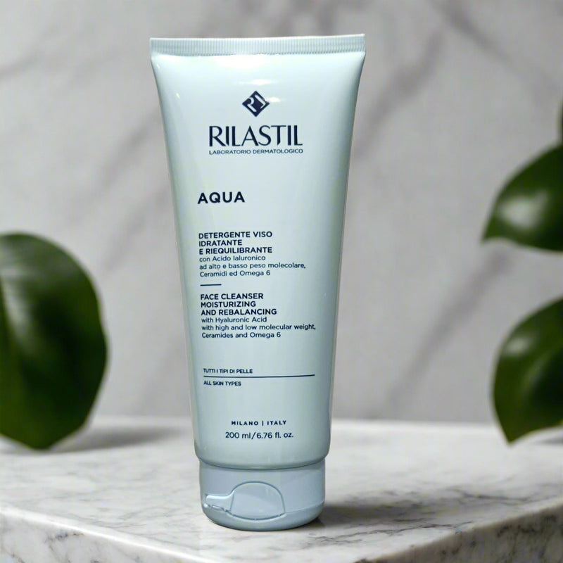 Rilastil Aqua Moisturizing and Rebalancing Face Cleanser is a gentle yet effective cleanser designed to hydrate and restore balance to all skin types. Infused with high and low molecular weight Hyaluronic Acid, Ceramides, and Omega 6, it cleanses while providing deep hydration and rebalancing the skin's natural moisture levels. The non-drying formula leaves the skin feeling fresh, soft, and rejuvenated, making it perfect for daily use, especially for sensitive skin.