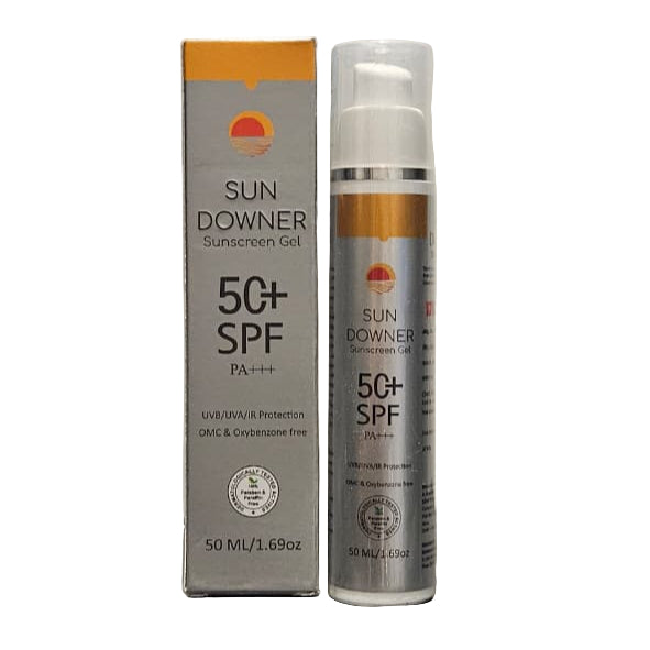 Sun Downer Sunscreen Gel SPF 50+ PA+++ is a lightweight, non-greasy sunscreen designed for Indian skin and weather conditions. It offers broad-spectrum protection that helps shield skin from UVA, UVB, and infrared (IR) rays. The gel texture absorbs quickly, leaving the skin feeling comfortable and fresh without a white cast, making it ideal for daily use on all skin types — including oily, acne-prone, and sensitive skin.