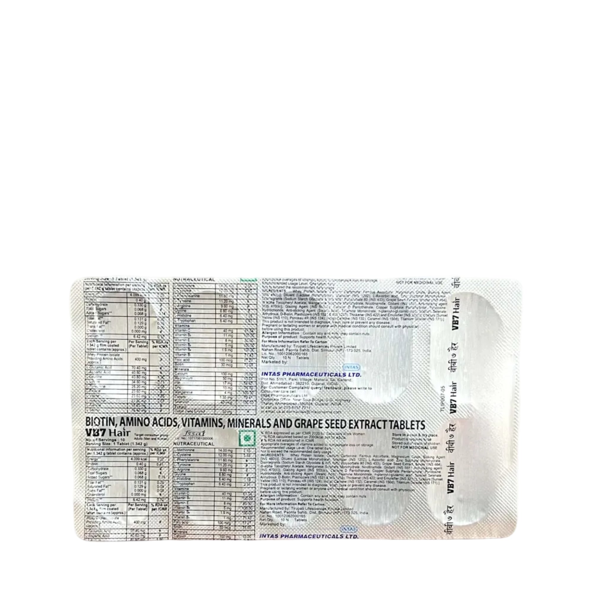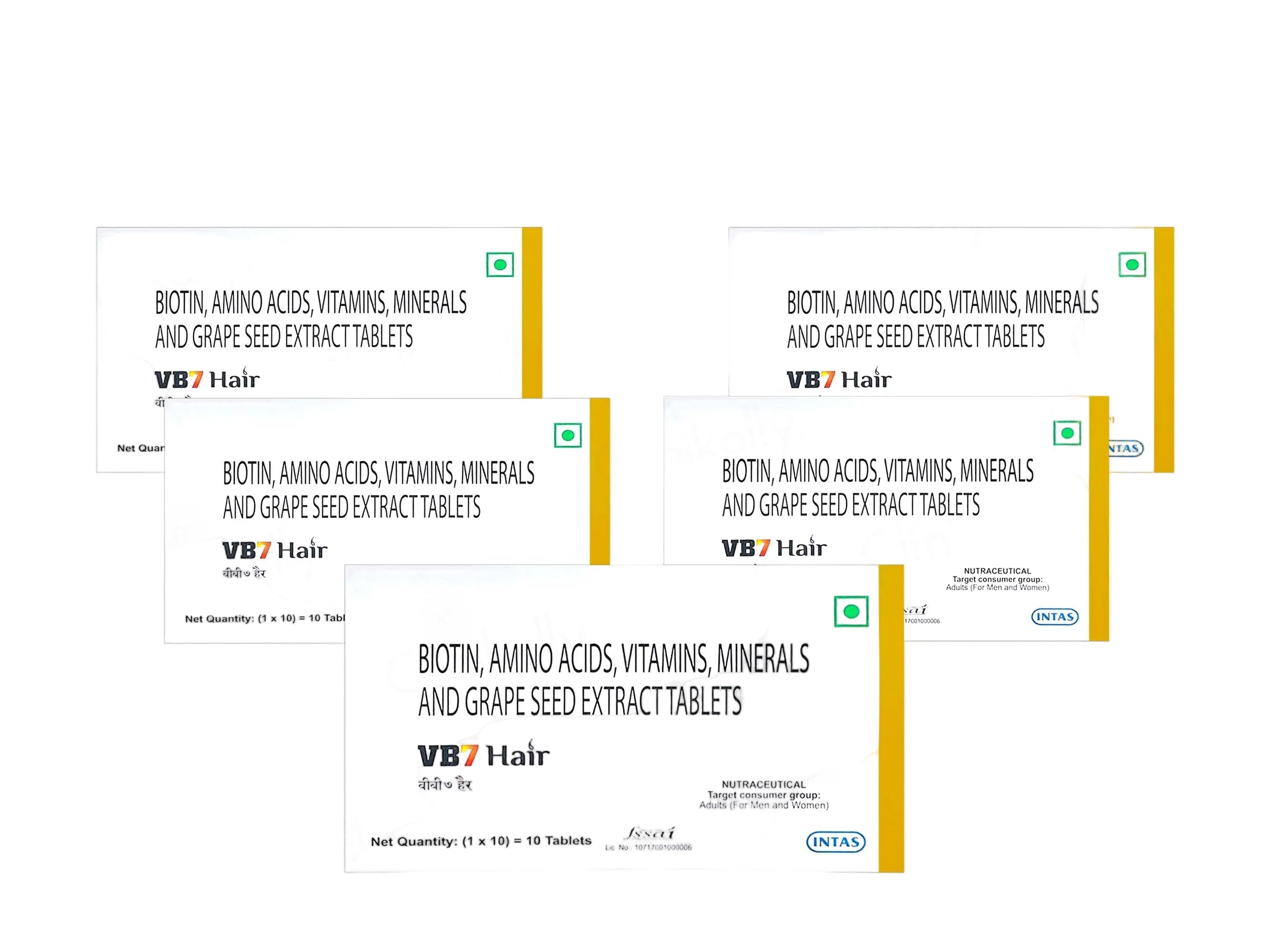 VB7 Hair Tablet is a nutritional supplement designed to support healthy hair growth and improve hair quality. It contains Biotin, Amino Acids from Whey Protein Isolate, Grape Seed Extract, Multivitamins, and Multiminerals.